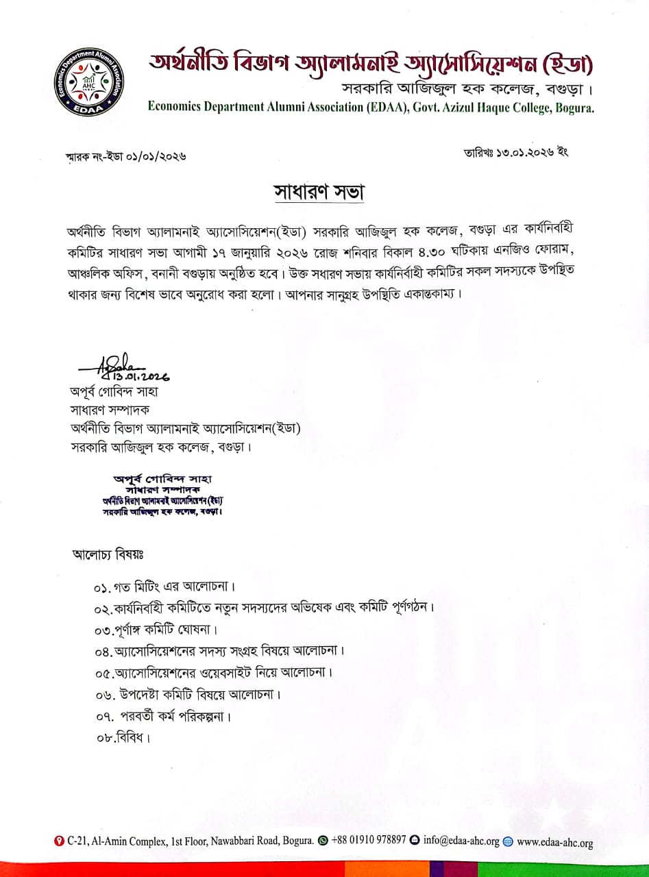 সাধারণ সভায় যথা সময়ে উপস্থিতি একান্তভাবে কামনা করছি।